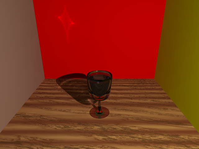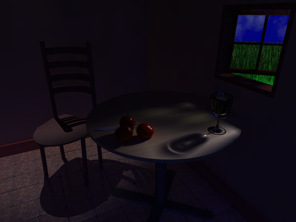 The scene consists of a room, a table, a chair, apples, a wineglass with water, a knife, and grass outside. Each of these entities are defined in their own files and included into the main scene. No external resources were used in making the scene (except for the POVray documentation).