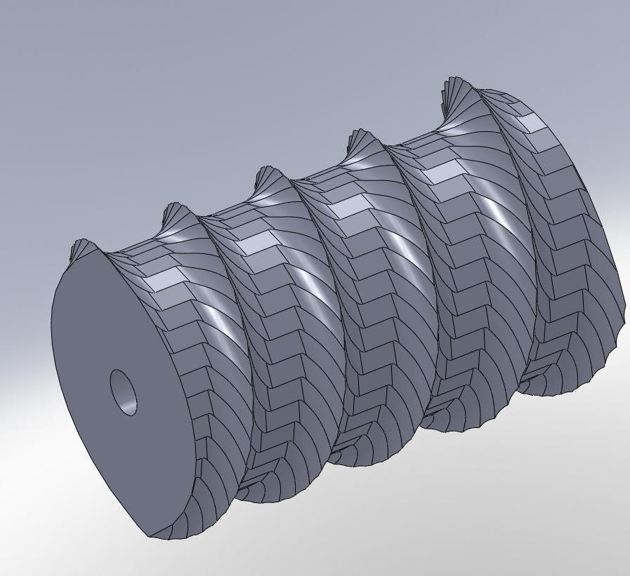 Traditionally, conveyor screws have been designed via a discretized approach using boolean operations. This results in thousands of sliver faces and a non-smooth solution. Figure below shows an example of such an approach. Download a 3D model of the same in pdf format. Scroll to the bottom of the page for directions on viewing the 3D pdf.