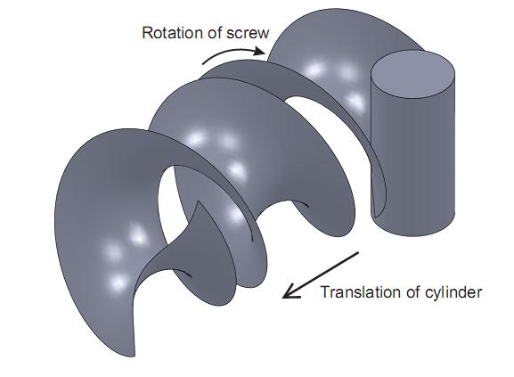 Complex product handling requirements in manufacturing plants can be met with conveyor screws. The product sits inside the groove of the screw which rotates about its own axis, thereby imparting the desired motion to the object. In the adjoining figure the elliptical bottle translates as well as rotates about its own axis as the screw rotates. A video of a conveyor screw from a proprietary source can be seen here.