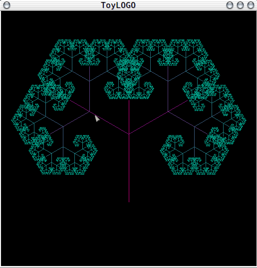 A line of Length L is drawn as base. Subsequent lines are drawn at 2/3rd height of the base line, with lengths equal to 2L/3 and at an angle of 120 degrees in the right and left directions.Color grading is done based on the current length of the line.