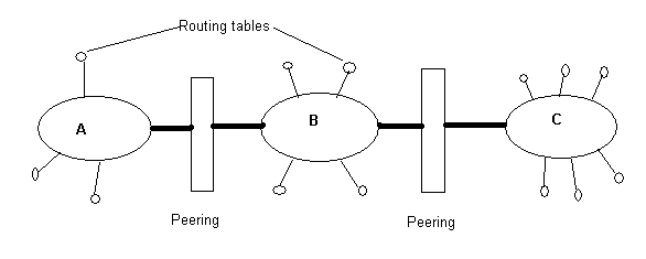 Peering means ISPs reciprocally provide to each other connectivity. For eg. in the above fig. customers of A can reach customers of B. Peering is however non-transitive. So while customers of B can reach customers of A they cannot reach customers of C.