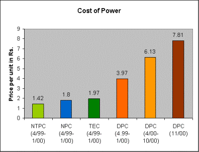 DPC power was more than twice as expensive power from any other sources in April 99. Over the last two years, the subsequent escalation of this already exhorbident cost has been alarming. Remember that each additional paisa increase in the average cost of power costs the state of Maharashtra Rs 3 crore annually.