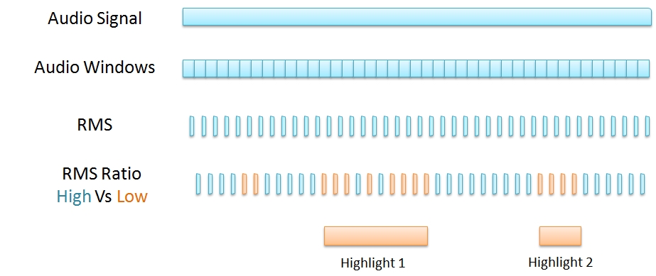 The intensity of a segment of an audio signal is summarized by the root-mean-square value. The audio track of a video is divided into windows of equal size and the rms value is computed for each audio window. From the resulting rms sequence, the rms ratio is computed for successive items in the sequence.