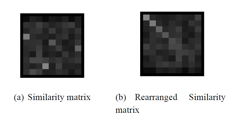Our second feature works with the sequence of tuple in tuple matrices. For each tuple matrix, the number of common tuples from the tuple matrixes are computed. This results in a similarity matrix of size N/c$ where each point corresponds to a tuple. The similarity measure is computed by summing up the exponential values of data from the similarity matrix. This measure is used for identifying remakes which have same music.