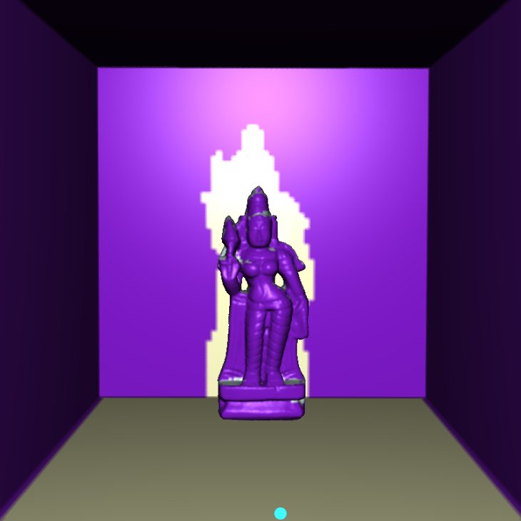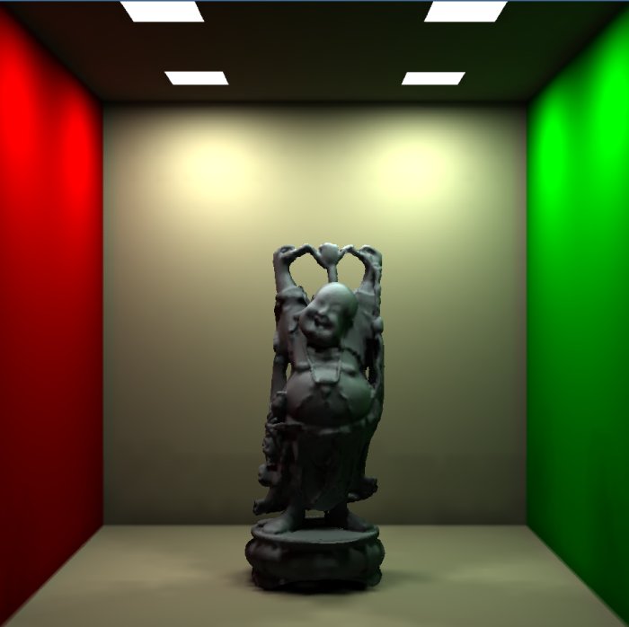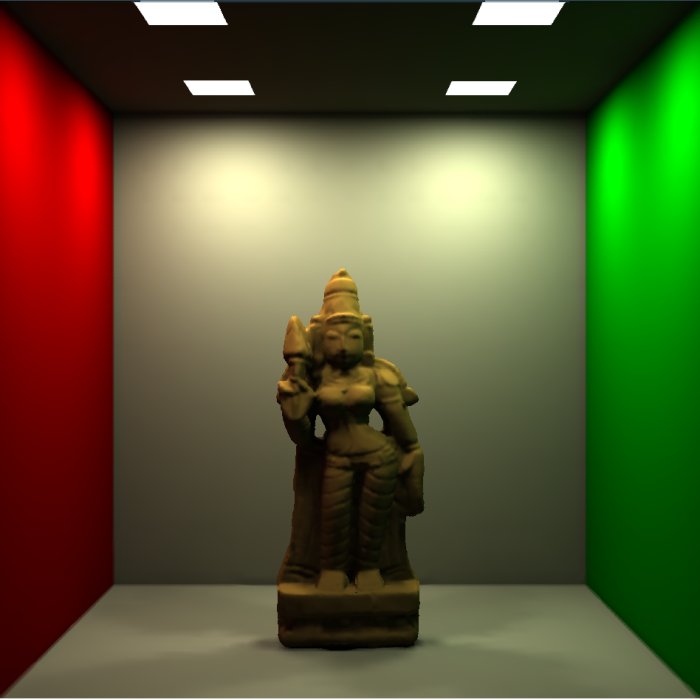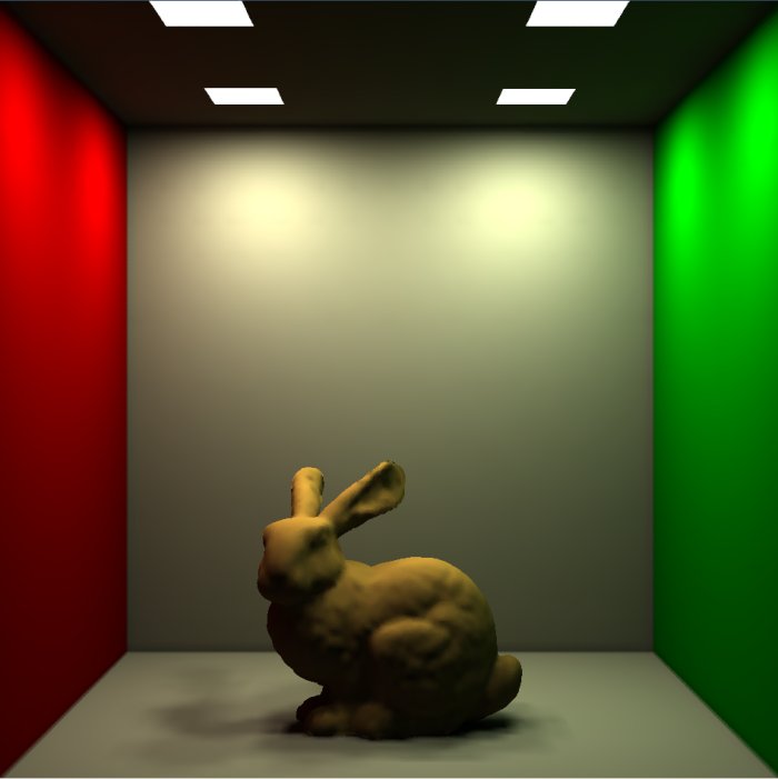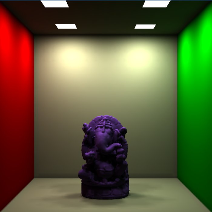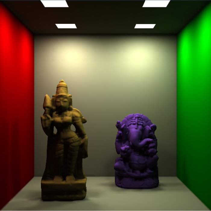 of bunny and Ganesha in a Cornell room each having four light sources on the ceiling.